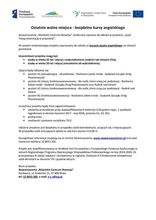 Ostatnie wolne miejsca - bezpłatne kursy angielskiego Opublikowano: 29 marca 2017 08:23 Kategoria: Aktualności Wydrukuj Wyświetleń: 830 Zobacz równieżList Prezesa KRUS do rolników OFERTA WSPARCIA FINANSOWEGO PRZEDSIĘBIORCÓW I...Nabór do projektu „Czas na Karierę” Ostatnie wolne miejsca - bezpłatne kursy...Wystawa "Czar Starej Fotografii" Informacja o waloryzacji emerytur i rent...