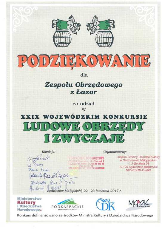 W dniu 22 kwietnia zespół obrzędowy z Łazor działajacy pod patronatem Gminnego Ośrodka Kultury w Harasiukach wziął udział w XXIX Wojewódzkim Konkursie „LUDOWE OBRZĘDY I ZWYCZAJE” w Sędziszowie Małopolskim. Prezentacje konkursowe odbywały się w dniach 22 – 23 kwietnia w których udział wzięło łącznie 17 zespołów z terenu województwa podkarpackiego. Zespół obrzędowy z Łazor prezentował widowisko pt. „Kłuserskie Żywoty” za które otrzymał wyróżnienie.