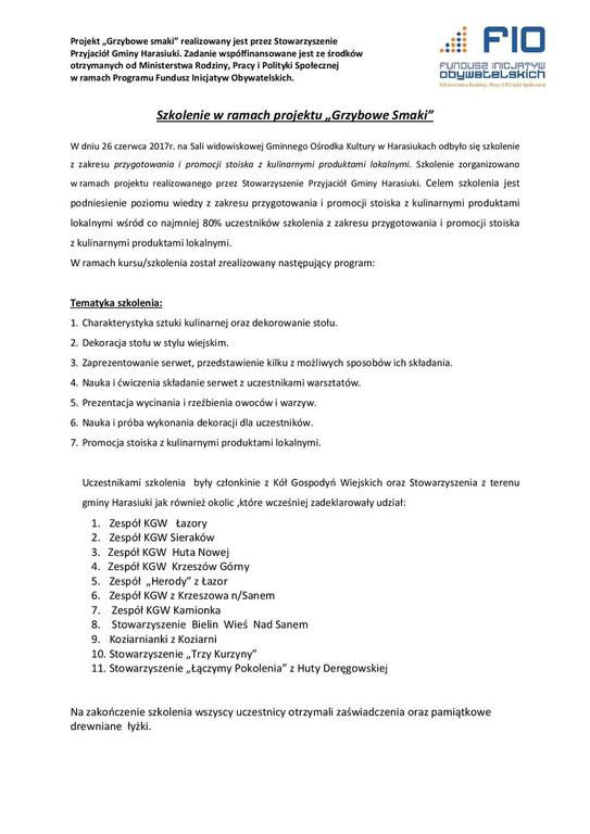 Szkolenie w ramach projektu "Grzybowe smaki" GALERIA ZDJĘĆ Opublikowano: 27 czerwca 2017 09:41 Kategoria: Aktualności Wydrukuj Wyświetleń: 875 Zobacz równieżBezpłatne kursy komputerowe Harmonogram spotkań informacyjnych w ramach...Informacja o otwarciu ofertSzkolenie w ramach projektu "Grzybowe smaki"Ogłoszenie - warsztaty kulinarne Zawody sportowo-pożarnicze jednostek OSP z terenu...