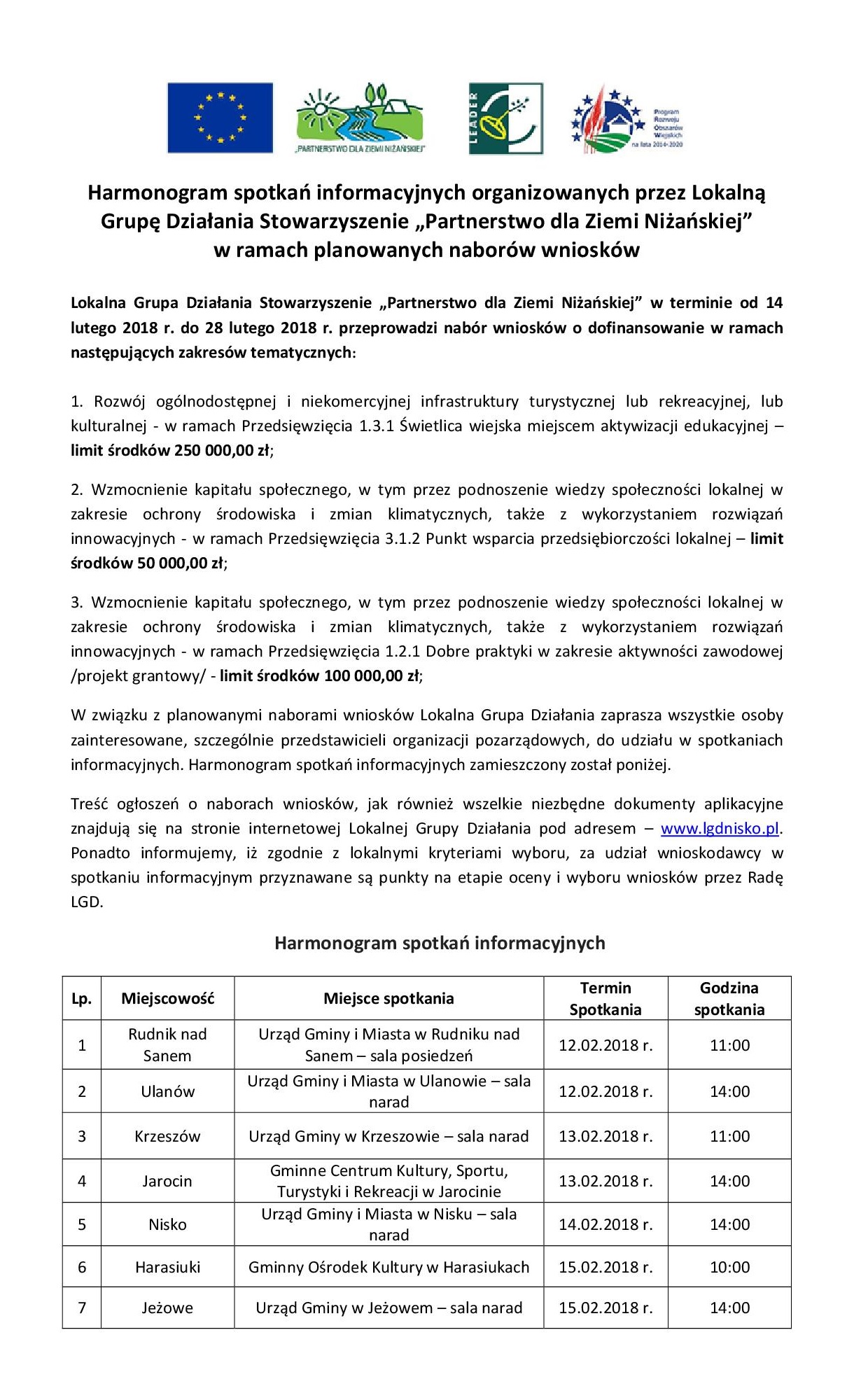 Harmonogram spotkań informacyjnych organizowanych przez Lokalną Grupę Działania Stowarzyszenie „Partnerstwo dla Ziemi Niżańskiej” w ramach planowanych naborów wniosków