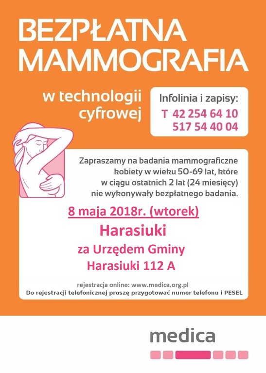 Bezpłatna mammografia Opublikowano: 13 kwietnia 2018 09:49 Kategoria: Aktualności Wydrukuj Wyświetleń: 801 Zobacz również ZAPROSZENIE NA XXXIX SESJĘ RADY GMINY W...OBWIESZCZENIE WÓJTA GMINY HARASIUKIElektroniczne zwolnienia lekarskie – „e-ZLA”Bezpłatna mammografia Harmonogram spotkań informacyjnych organizowanych... Nabór na świadczenie specjalistycznych usług...