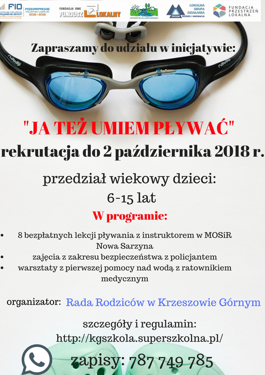 "Ja też umiem pływać" Opublikowano: 26 września 2018 15:01 Kategoria: Aktualności Wydrukuj Wyświetleń: 582 Zobacz również PCPR W NISKU POSZUKUJE KANDYDATÓW NA RODZINY... Rehabilitacja lecznicza dla rolników realizowana... INFORMACJA o przebiegu konsultacji projektu..."Ja też umiem pływać" ZAPROSZENIE NA NADZWYCZAJNĄ XLIV SESJĘ RADY GMINY...Nabór do projektu „Kierunek zatrudnienie”