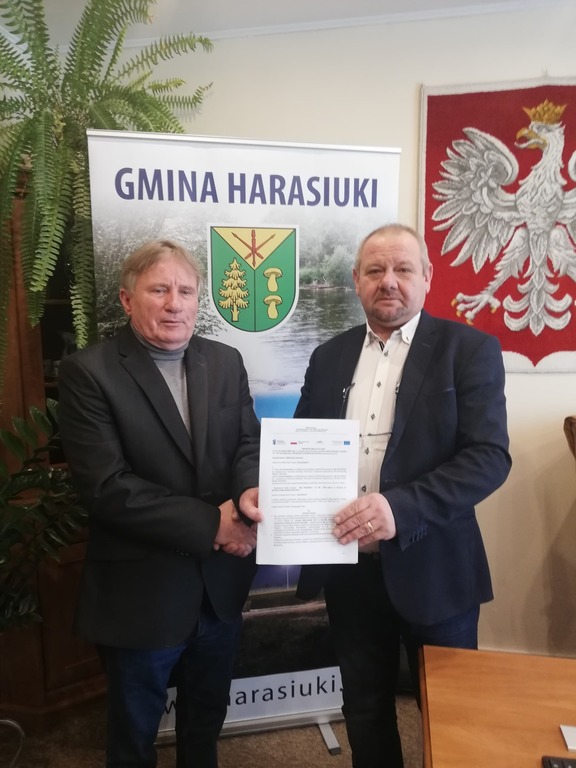 W dniu 16 stycznia 2019 roku została podpisana umowa pomiędzy Gminą Harasiuki, reprezentowaną przez Wójta Gminy Harasiuki Krzysztofa Kiszkę, a Panem Jerzym Baranowskim, przedsiębiorcą prowadzącym działalność gospodarczą pn. B&Z PROENERGY, S.C. ul. Klonowa 13, 84 – 300 Lębork na dostawę i montaż instalacji fotowoltaicznych na obiektach użyteczności publicznej realizowanych w ramach projektu pn. „Rozwój mikroinstalacji OZE na potrzeby budynków i obiektów użyteczności publicznej w gminie Harasiuki” współfinansowanego ze środków Europejskiego Funduszu Rozwoju Regionalnego w ramach Osi Priorytetowej nr III „Czysta energia” Regionalnego Programu Operacyjnego Województwa Podkarpackiego na lata 2014 – 2020.