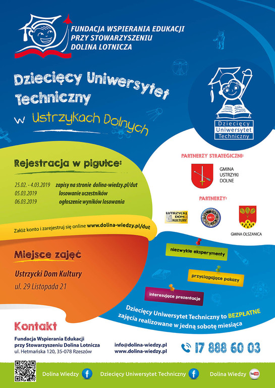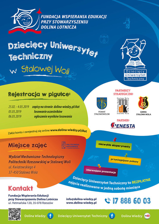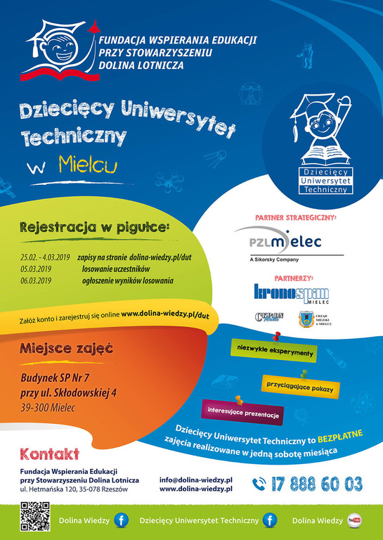 Po raz kolejny Fundacja Wspierania Edukacji przy Stowarzyszeniu Dolina Lotnicza, ogłasza nabór na zajęcia Dziecięcego Uniwersytetu Technicznego. Zapisy online na semestr letni 2019 startują 25 lutego 2019 o godz. 10.