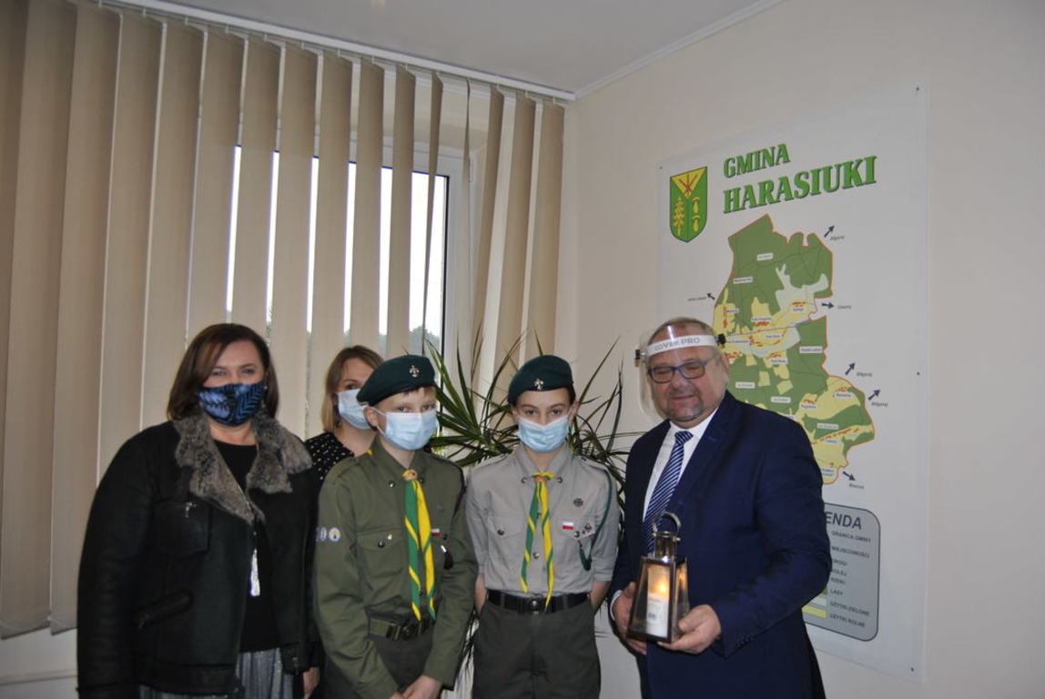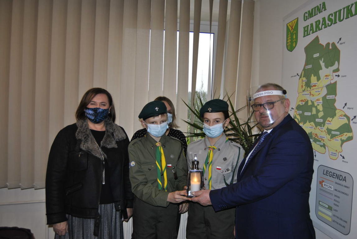 Wzorem lat poprzednich, w dniu 18 grudnia 2020 r. harcerze z DH IGNIS działającej przy Publicznej Szkole Podstawowej w Harasiukach przekazali na ręce Wójta Gminy Harasiuki - Pana Krzysztofa Kiszka ogień z betlejemskiej groty Narodzenia Pańskiego.