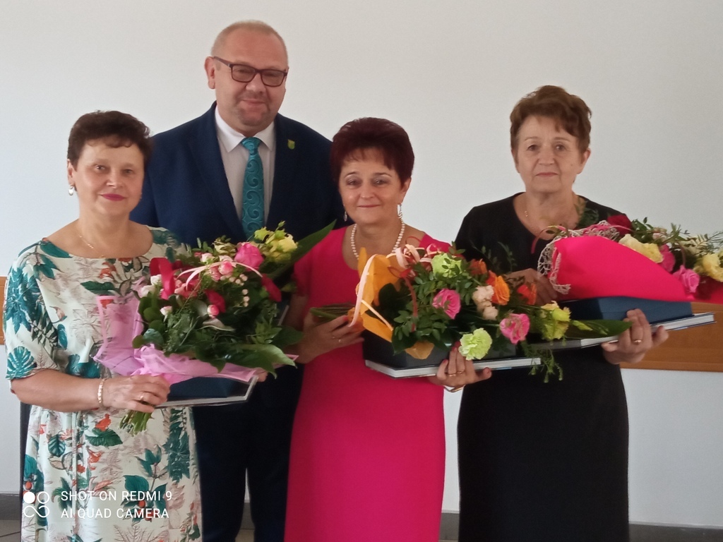 Podczas spotkania Wójt Gminy Krzysztof Kiszka podziękował pracownikom odchodzącym na emeryturę za lata pracy na rzecz społeczności tej gminy.