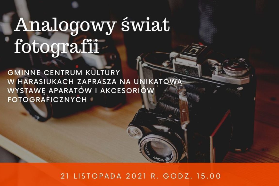 Gminne Centrum Kultury w Harasiukach zaprasza na pokaz analogowych aparatów i akcesoriów fotograficznych pt. "Analogowy Świat Fotografii", który odbędzie się w dniu 21 listopada 2021r. o godz. 15.00 w sali widowiskowej GCK w Harasiukach. Podczas pokazu będzie można zobaczyć analogowe aparaty i akcesoria fotograficzne z dawnych lat.