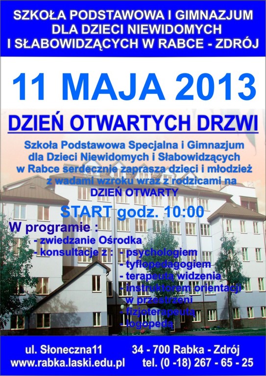 Szkoła Podstawowa i Gimnazjum dla Dzieci Niewidomych i Słabowidzących w Rabce Zdrój serdecznie zaprasza dzieci i młodzież z wadami wzroku wraz z rodzicami i wszystkich zainteresowanych na Dzień Otwarty.