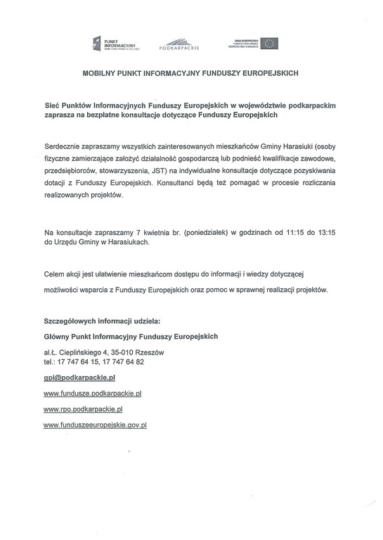 Mobilny Punkt Informacyjny Funduszy Europejskich Opublikowano: 01 kwietnia 2014 15:59 Kategoria: Aktualności Wydrukuj Wyświetleń: 1359 Zobacz również Dziewczęta ZS Orlik Harasiuki najlepsze w finale... DOTACJE NA ZAŁOŻENIE WŁASNEJ FIRMY - nabór...XXVIII edycja Żółtego TygodniaMobilny Punkt Informacyjny Funduszy EuropejskichXLVII SESJA RADY GMINY W HARASIUKACH ZAPROSZENIE NA XLVII SESJĘ RADY GMINY W...