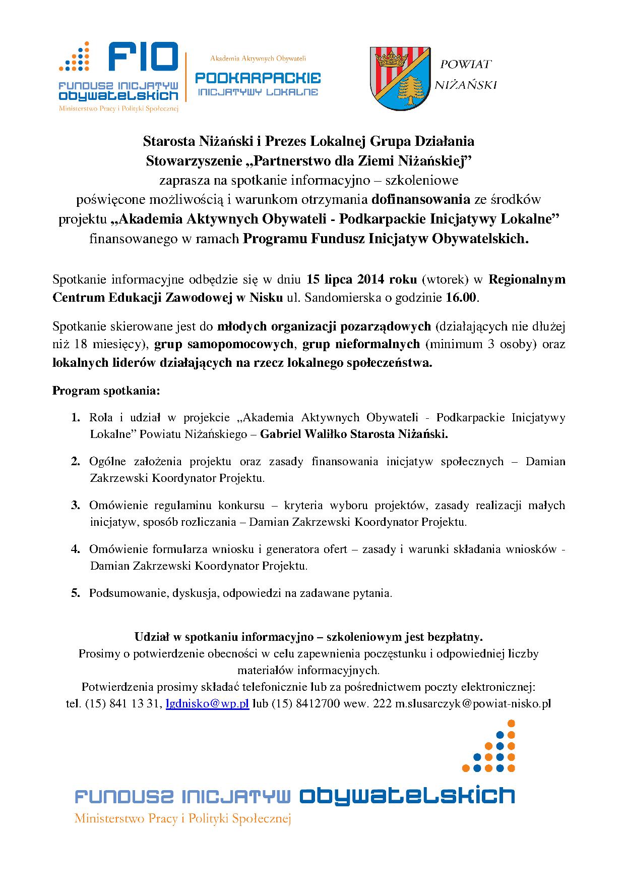 Spotkanie informacyjno – szkoleniowe poświęcone możliwością i warunkom otrzymania dofinansowania ze środków projektu „Akademia Aktywnych Obywateli - Podkarpackie Inicjatywy Lokalne” finansowanego w ramach Programu Fundusz Inicjatyw Obywatelskich.